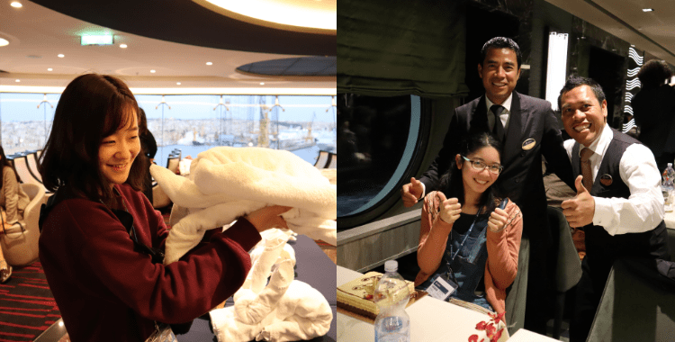 - クルーズ船内で働く一流レストランスタッフからテーブルマナーを習い、とても実践的で勉強になりました!