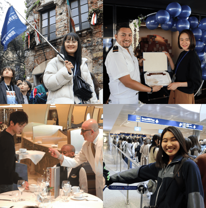 ヨーロッパ世界遺産の数々を豪華客船でクルージングしながら巡ります。添乗員は参加学生たちが務め、観光地の案内や移動中のマイクアナウンスを実践的に学べることも魅力です。研修中に旅行・ホテル・鉄道・空港などのお仕事にふれることで、進路の幅も広がります!